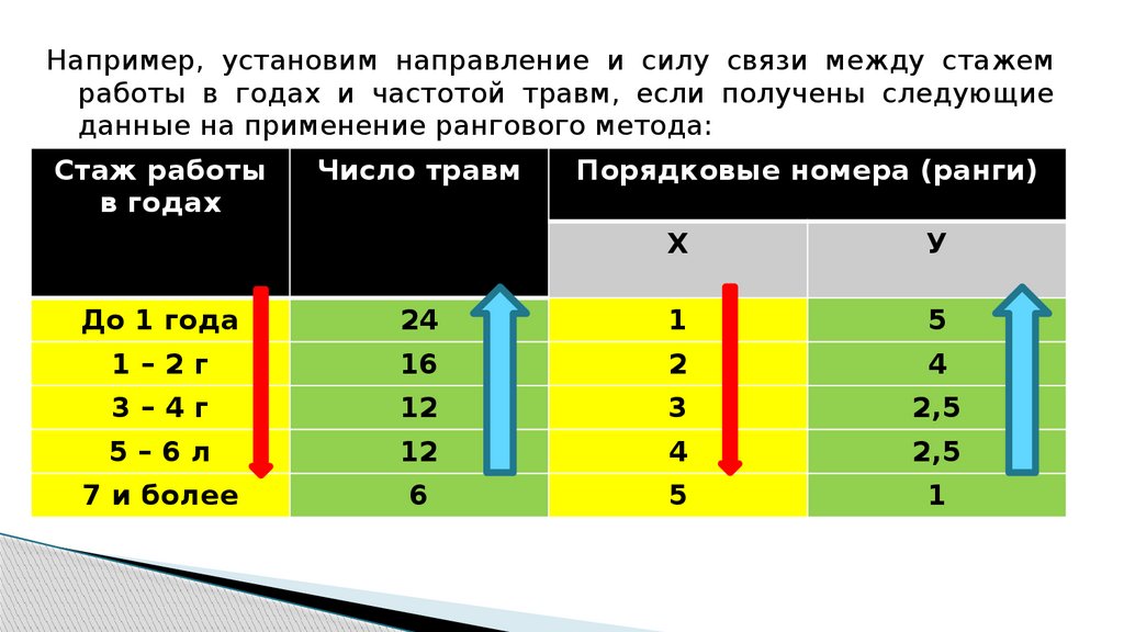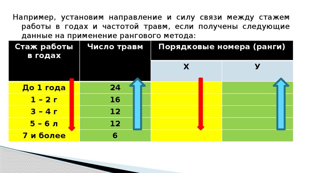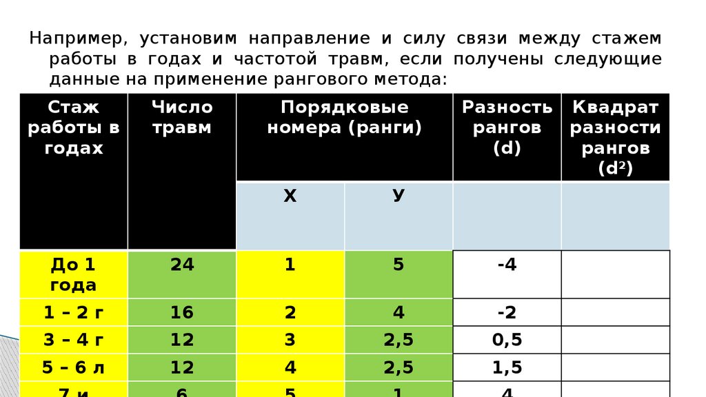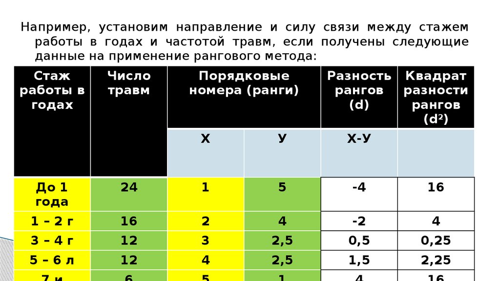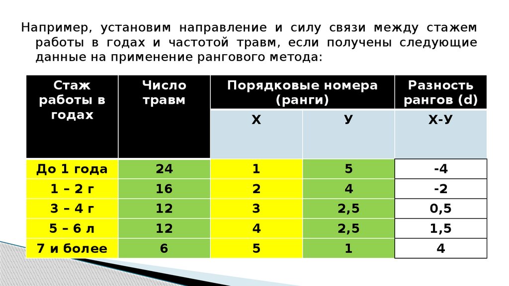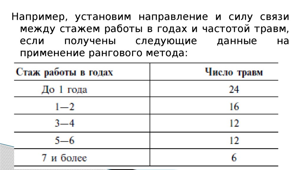 Например, установим направление и силу связи между стажемработы в годах и частотой травм, если получены следующие