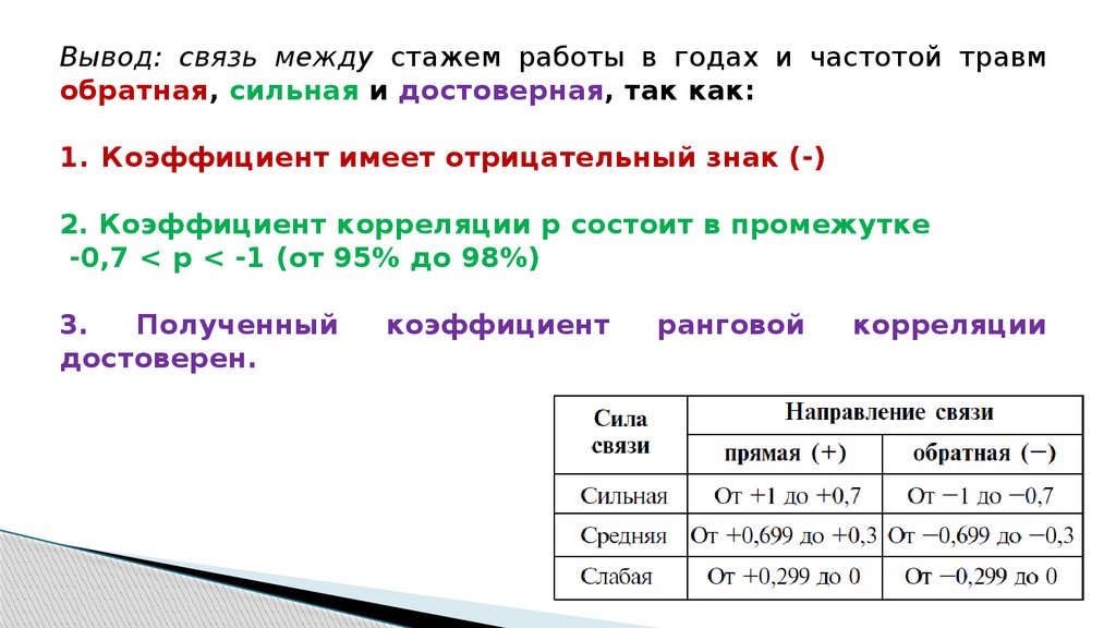 Например, установим направление и силу связимежду стажем работы в годах и частотой травм,
