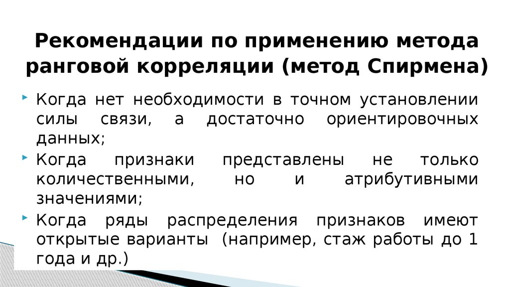 Рекомендации по применению методаранговой корреляции (метод Спирмена)