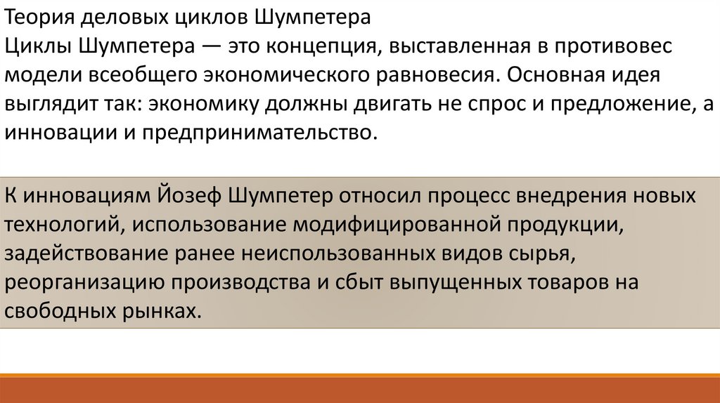 Теория деловых циклов ШумпетераЦиклы Шумпетера — это концепция, выставленная в противовес