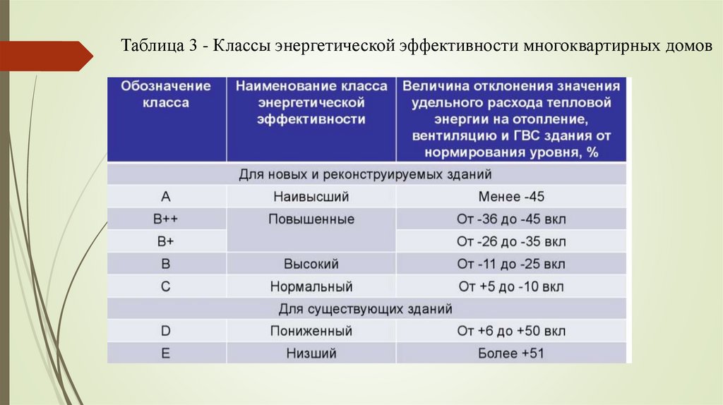Таблица 3 - Классы энергетической эффективности многоквартирных домов12.