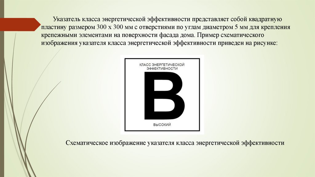Указатель класса энергетической эффективности представляет собой квадратнуюпластину размером 300 x 300 мм с отверстиями по углам диаметром 5 мм для крепления