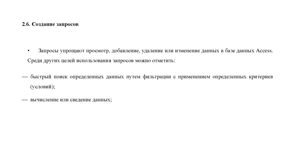 2.6. Создание запросовЗапросы упрощают просмотр, добавление, удаление или изменение данных в базе данных Access.