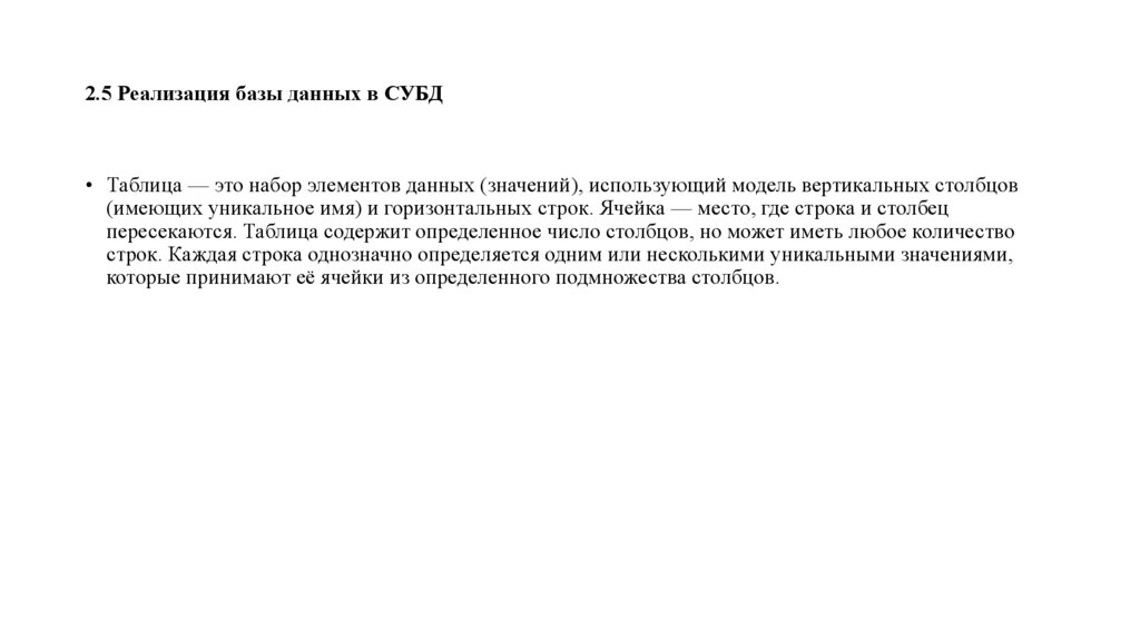 2.5 Реализация базы данных в СУБД• Таблица — это набор элементов данных (значений), использующий модель вертикальных столбцов