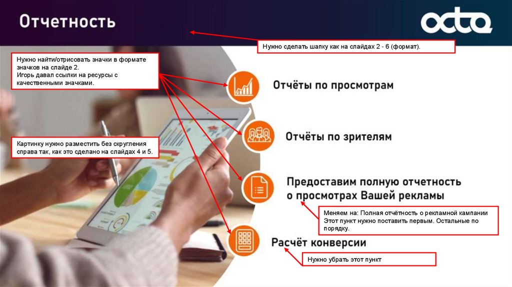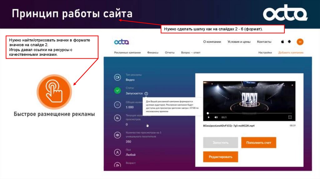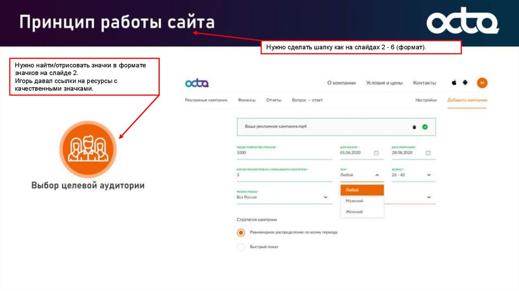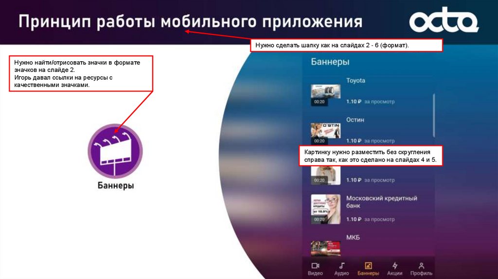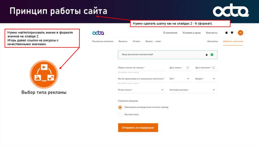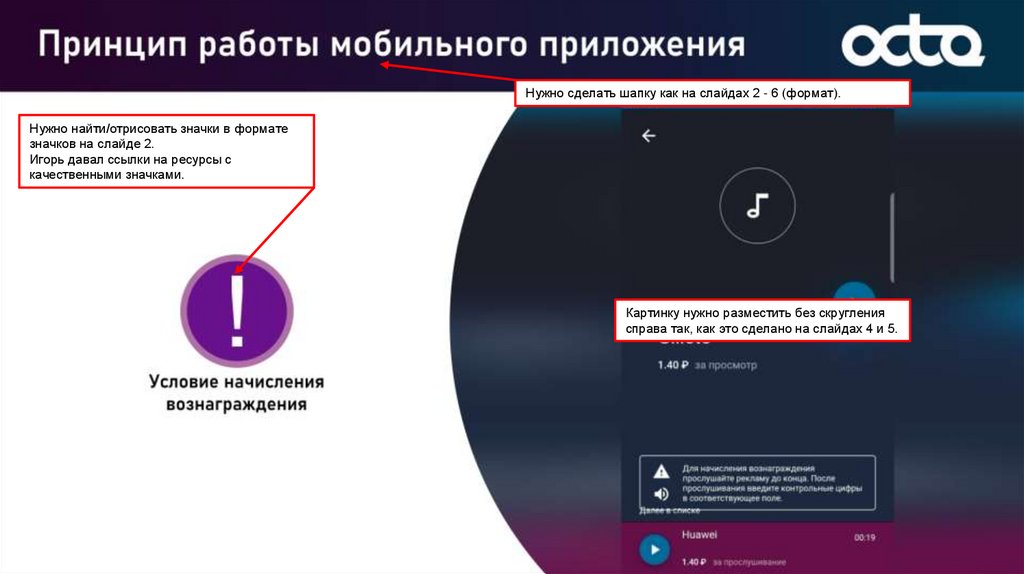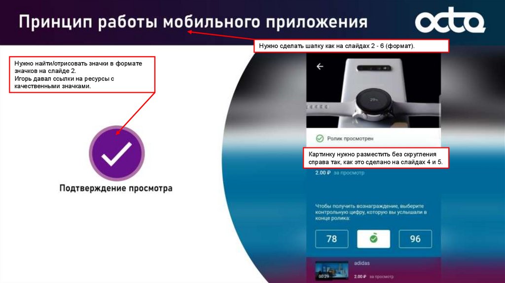 Нужно сделать шапку как на слайдах 2 - 6 (формат).Нужно найти/отрисовать значки в формате