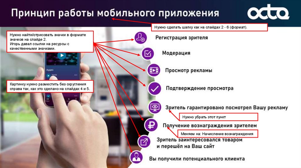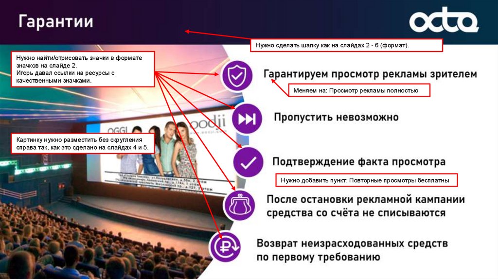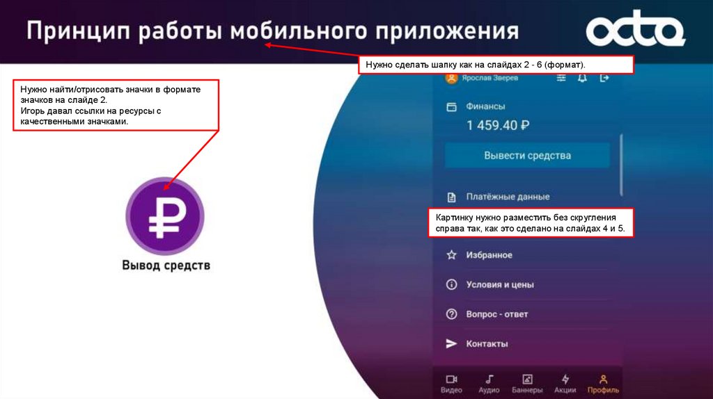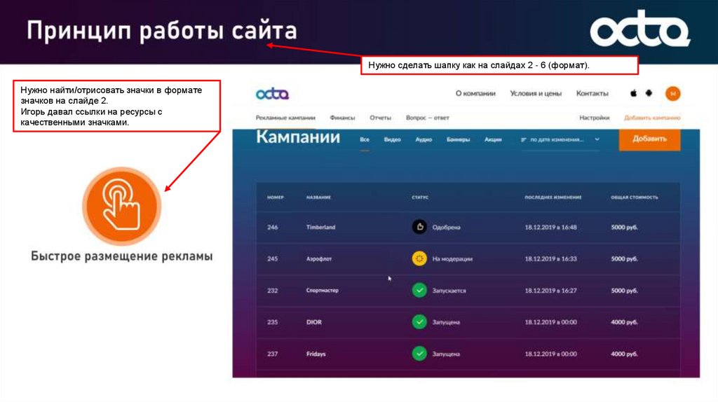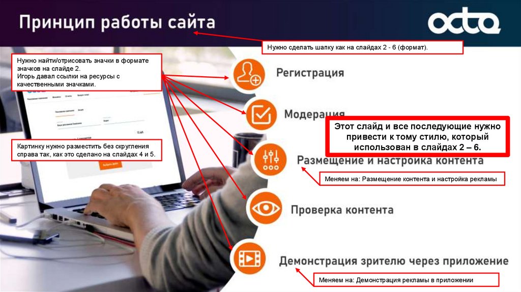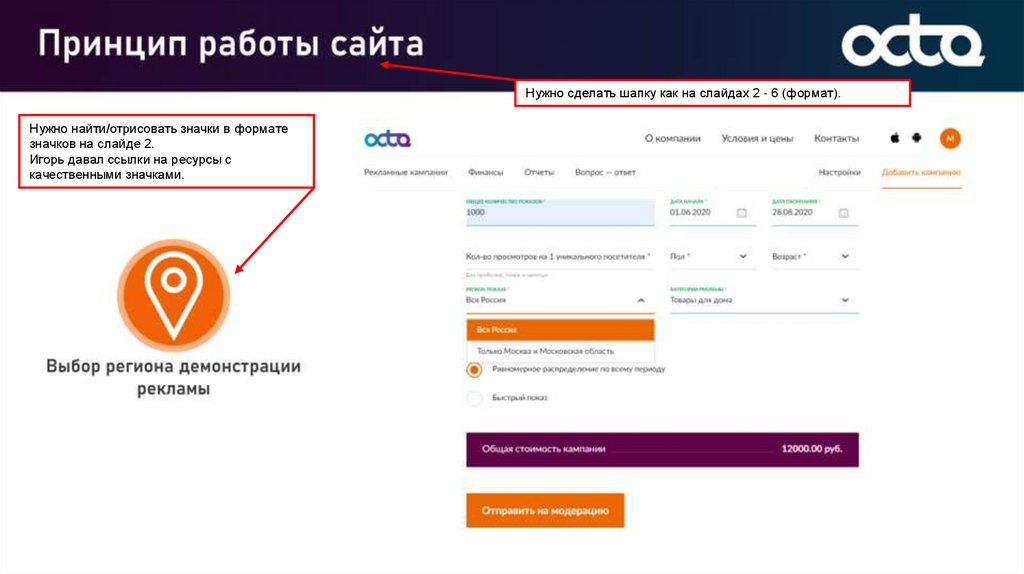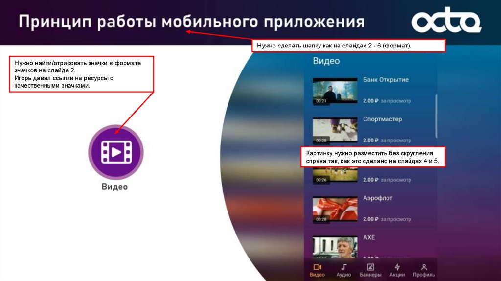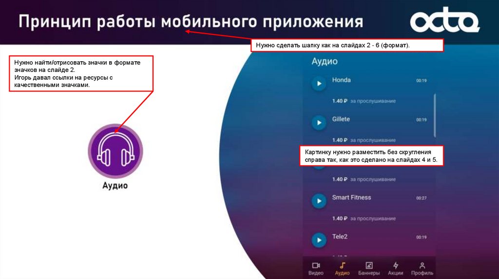 Нужно сделать шапку как на слайдах 2 - 6 (формат).Нужно найти/отрисовать значки в формате