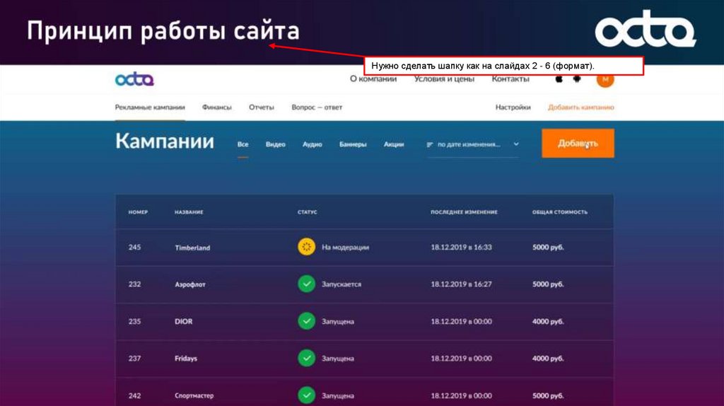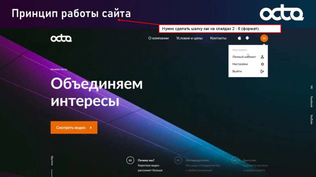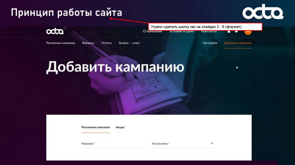 Нужно сделать шапку как на слайдах 2 - 6 (формат).9.