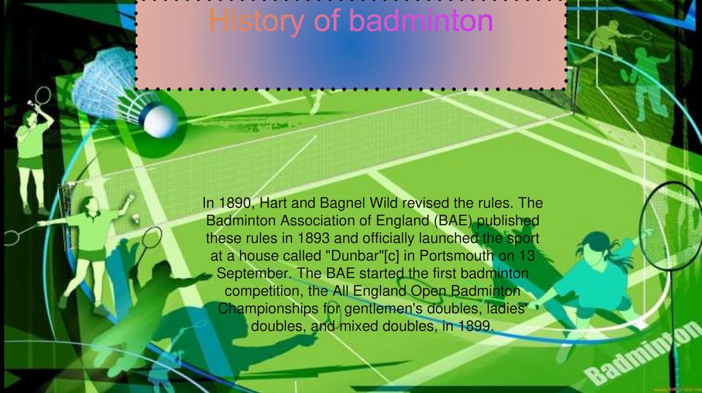 In 1890, Hart and Bagnel Wild revised the rules. TheBadminton Association of England (BAE) published