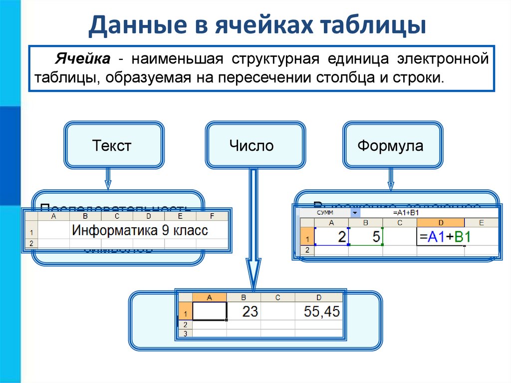 Данные в ячейках таблицыЯчейка - наименьшая структурная единица электронной
