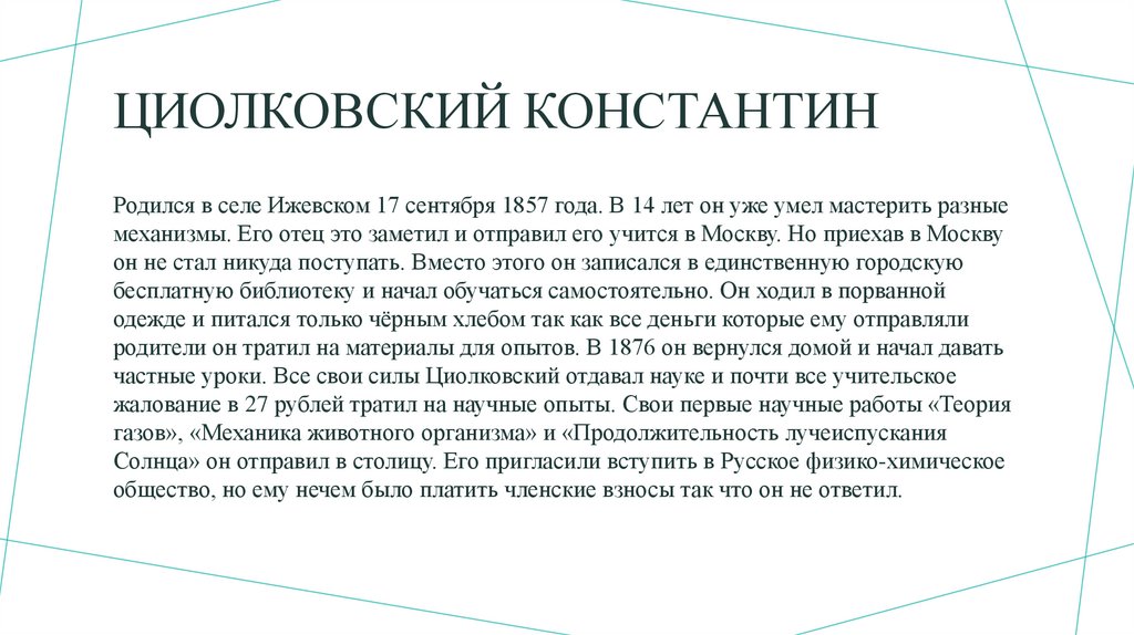 ЦИОЛКОВСКИЙ КОНСТАНТИНРодился в селе Ижевском 17 сентября 1857 года. В 14 лет он уже умел мастерить разные