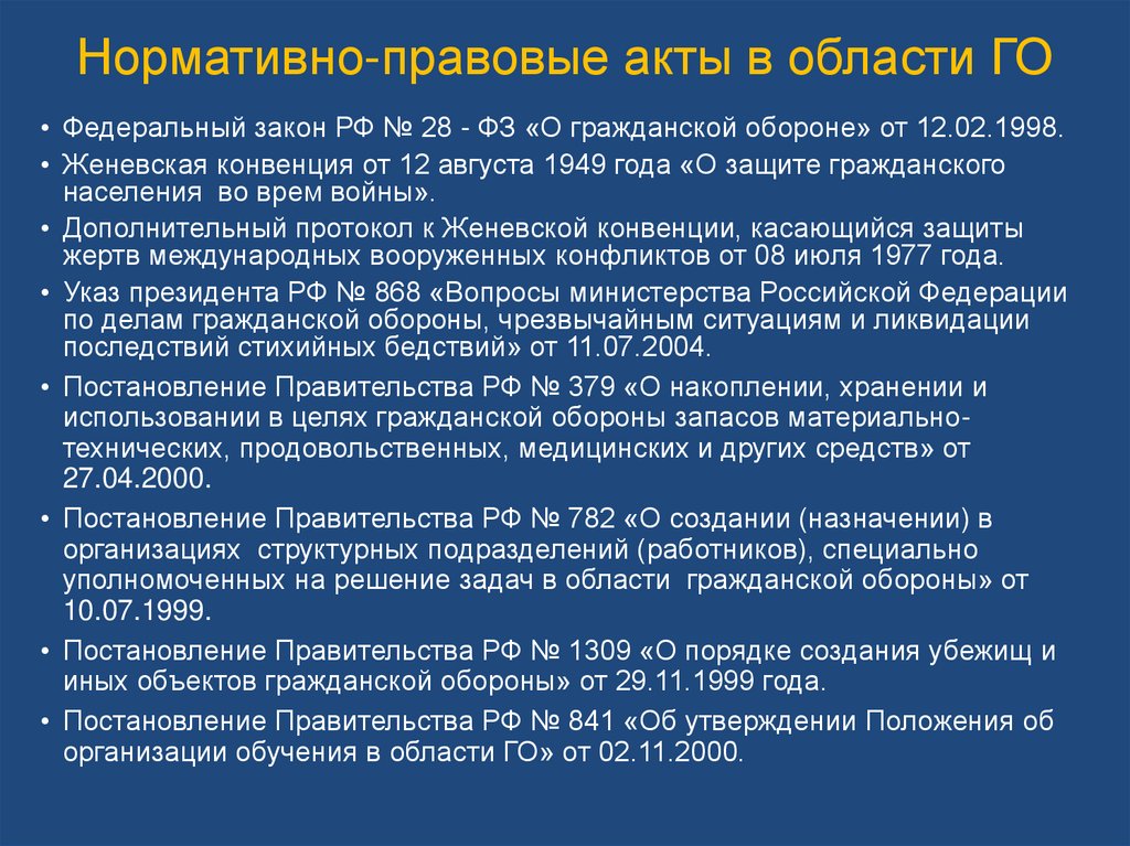 Нормативно-правовые акты в области ГО• Федеральный закон РФ № 28 - ФЗ «О гражданской обороне» от 12.02.1998.