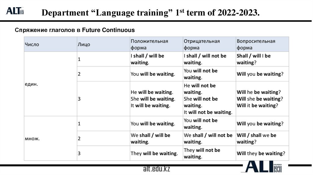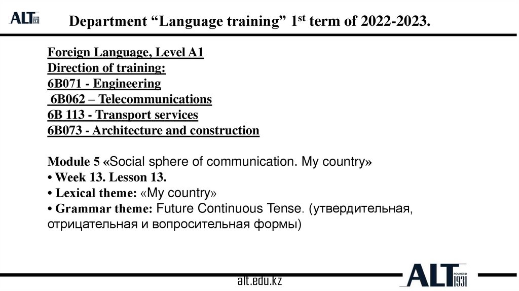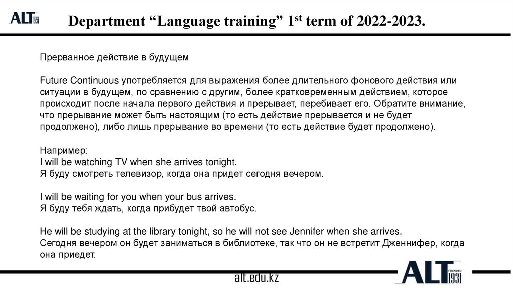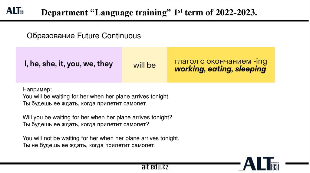 Department “Language training” 1st term of 2022-2023.Образование Future Continuous