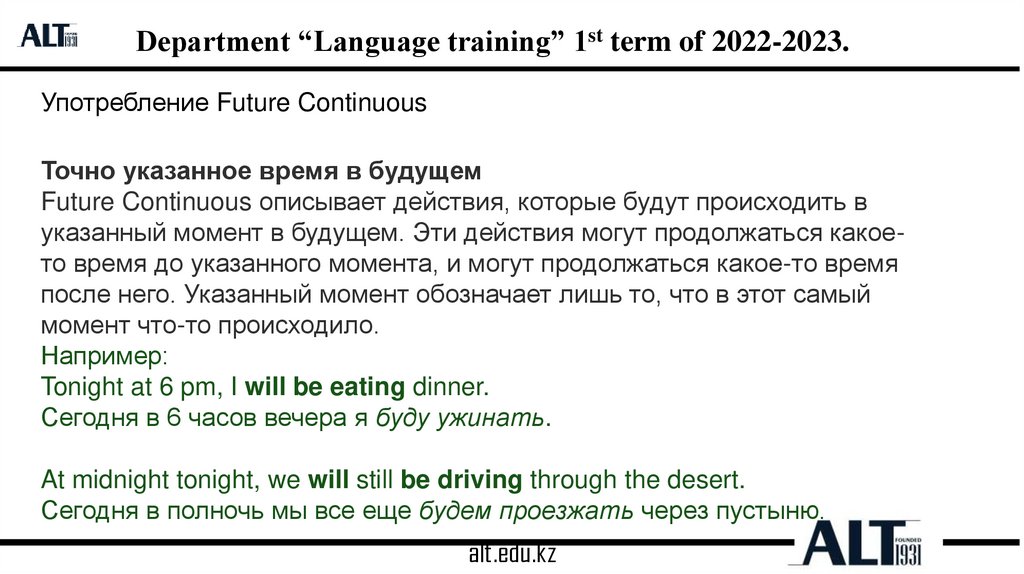 Department “Language training” 1st term of 2022-2023.Употребление Future Continuous