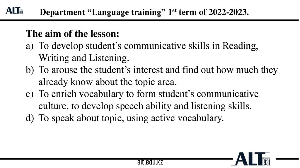 Department “Language training” 1st term of 2022-2023.The aim of the lesson:
