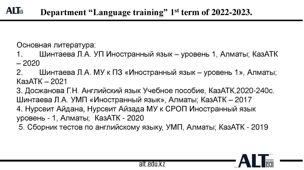 Department “Language training” 1st term of 2022-2023.Основная литература: