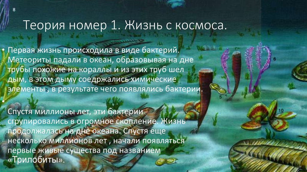 Теория номер 1. Жизнь с космоса.• Первая жизнь происходила в виде бактерий.
