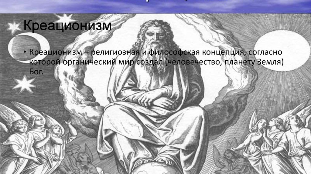 Креационизм• Креационизм – религиозная и философская концепция, согласно
