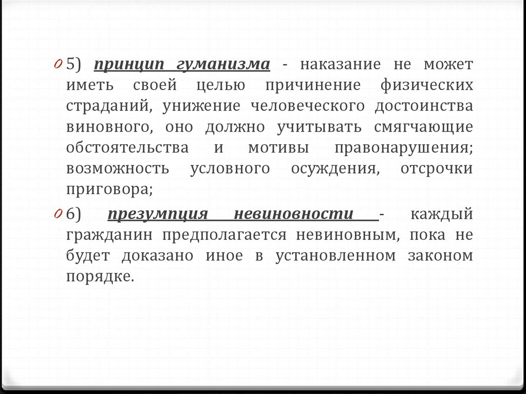 0 5) принцип гуманизма - наказание не можетиметь своей целью причинение физических