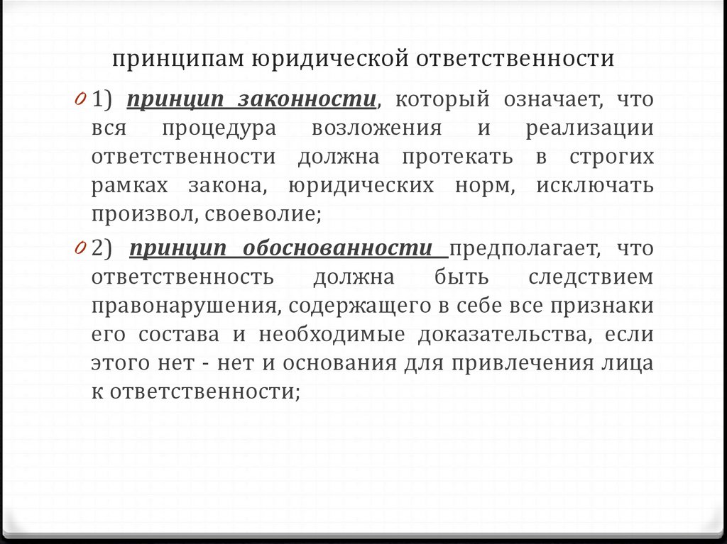 принципам юридической ответственности0 1) принцип законности, который означает, что
