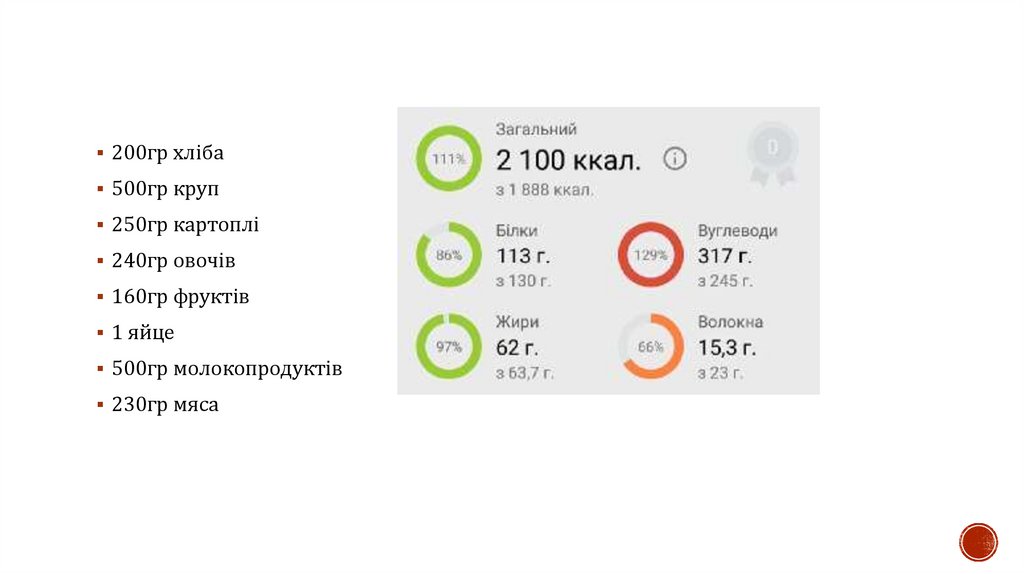 консервовані та сезонні (5 кг), фрукти (5 кг), соки (0,4 л), цукор (1,9 кг), мед (0,1 кг),
