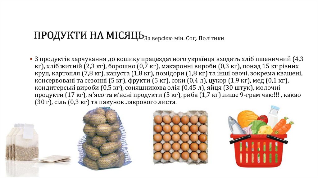 За версією мін. Соц. ПолітикиЗ продуктів харчування до кошику працездатного українця входять хліб пшеничний (4,3