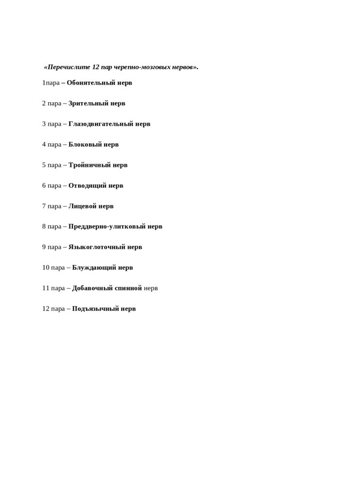 «Перечислите 12 пар черепно-мозговых нервов».1пара – Обонятельный нерв