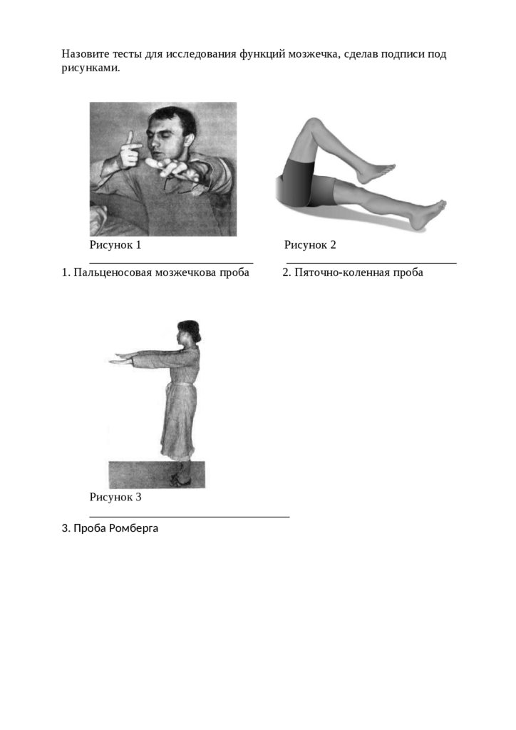 Назовите тесты для исследования функций мозжечка, сделав подписи подрисунками.