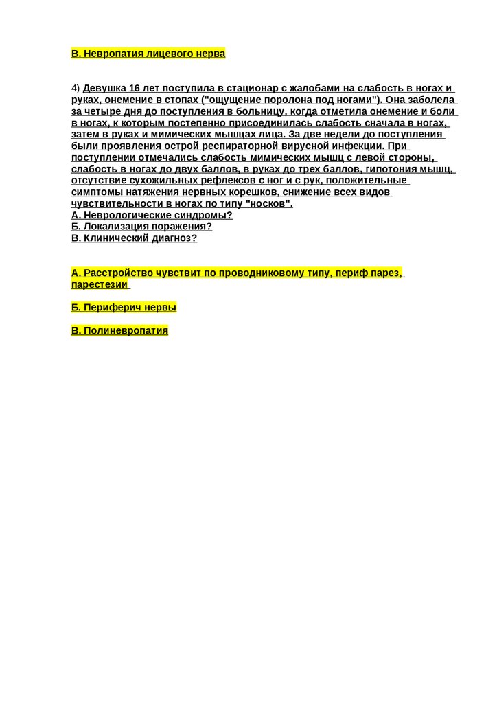 В. Невропатия лицевого нерва4) Девушка 16 лет поступила в стационар с жалобами на слабость в ногах и