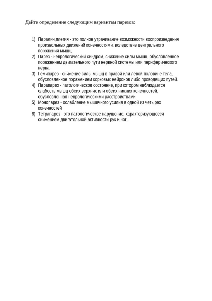 Дайте определение следующим вариантам парезов:1) Паралич,плегия - это полное утрачивание возможности воспроизведения