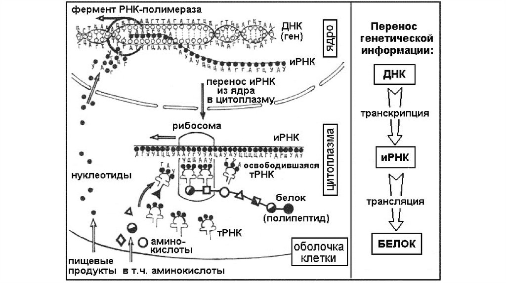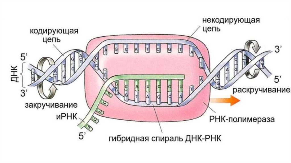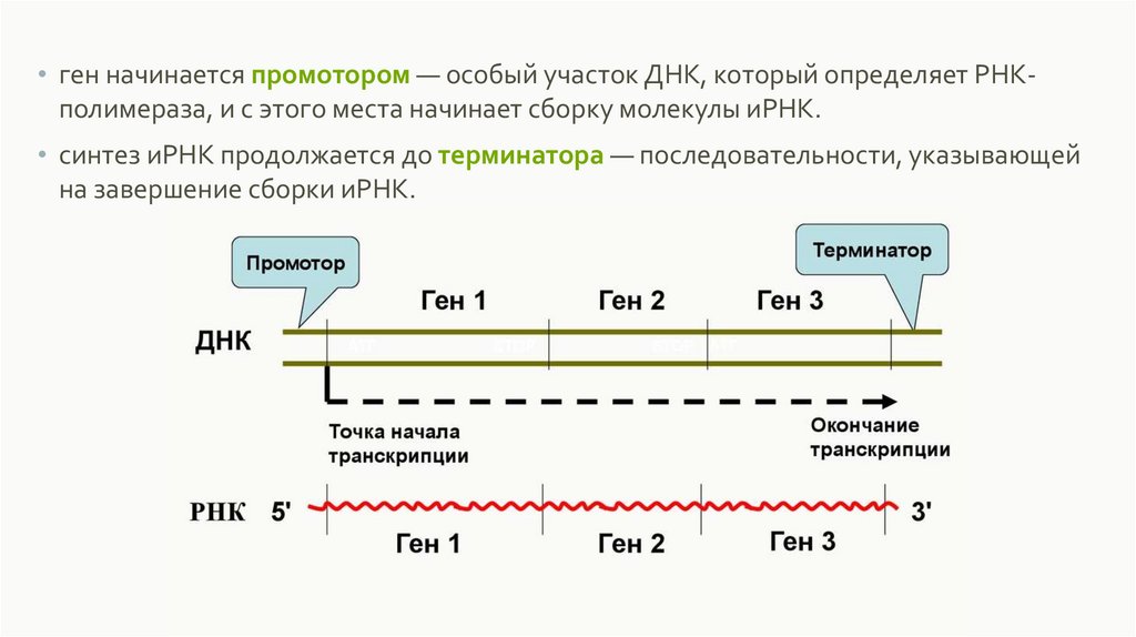 • ген начинается промотором — особый участок ДНК, который определяет РНКполимераза, и с этого места начинает сборку молекулы иРНК.• синтез иРНК продолжается до терминатора — последовательности, указывающей