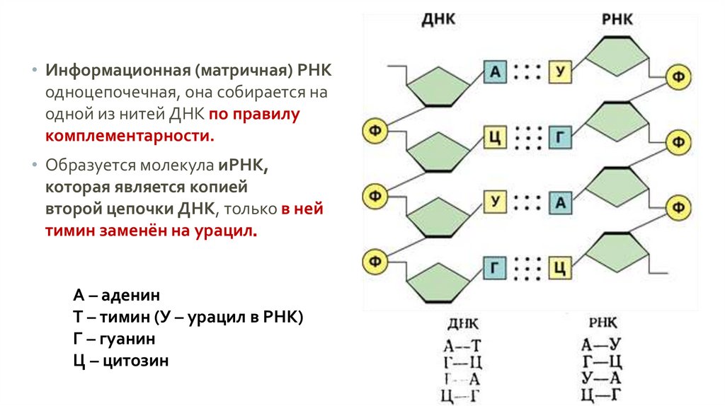 • Информационная (матричная) РНКодноцепочечная, она собирается на