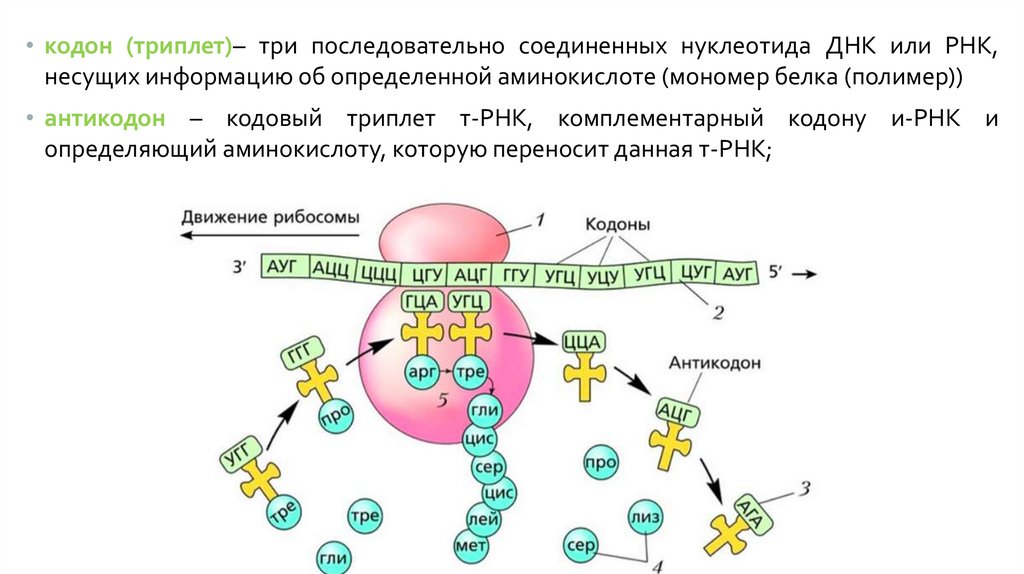 • антикодон – кодовый триплет т-РНК, комплементарный кодону и-РНК и
