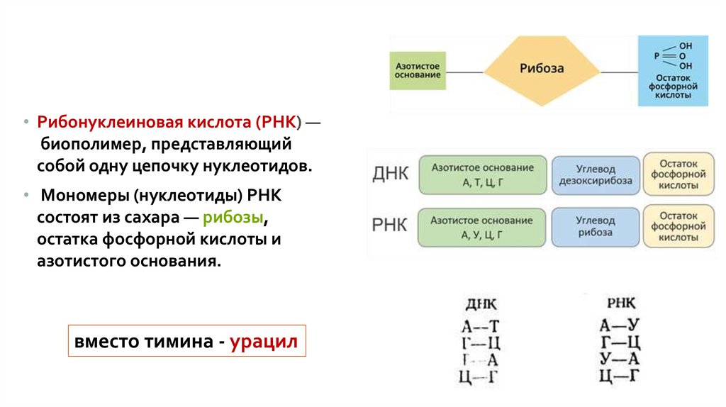 • Рибонуклеиновая кислота (РНК) —биополимер, представляющий
