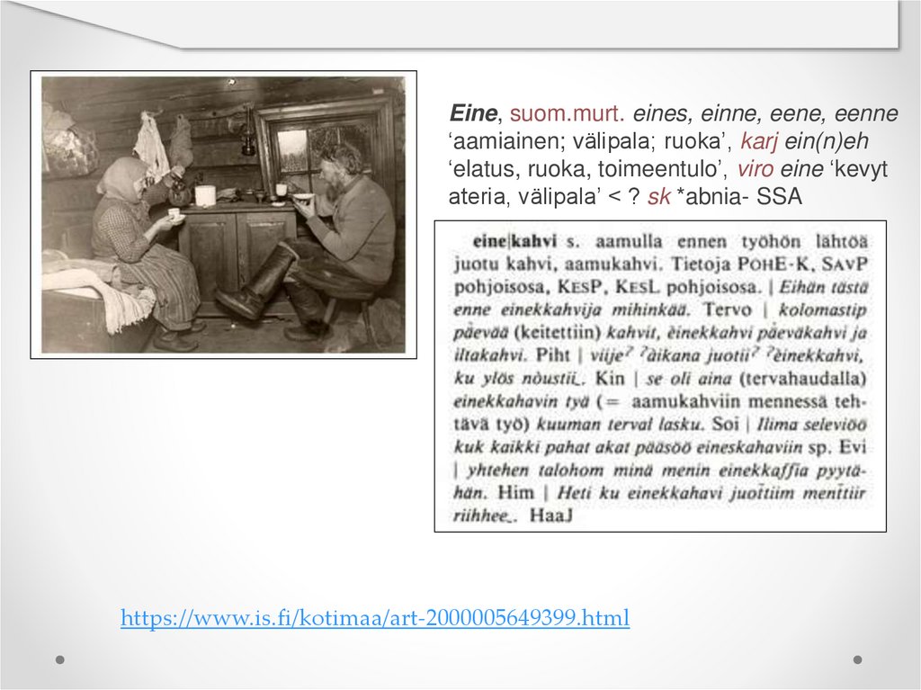 Eine, suom.murt. eines, einne, eene, eenne‘aamiainen; välipala; ruoka’, karj ein(n)eh