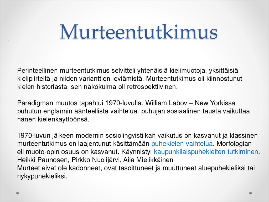 eli muoto-opin osuus on kasvanut. Käynnistyi kaupunkilaispuhekielten tutkiminen.
