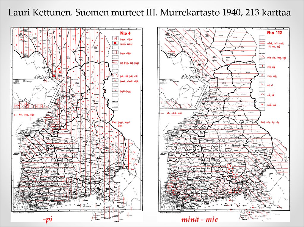 Lauri Kettunen. Suomen murteet III. Murrekartasto 1940, 213 karttaa-pi