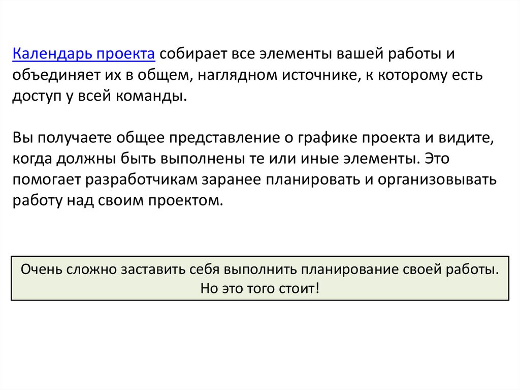 Календарь проекта собирает все элементы вашей работы иобъединяет их в общем, наглядном источнике, к которому есть