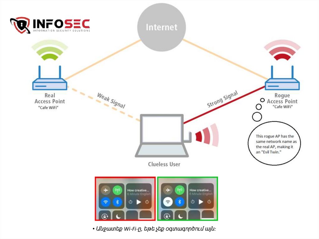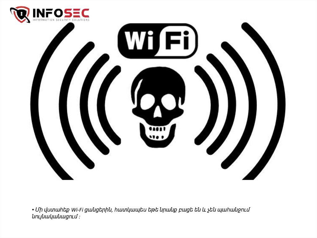 • Մի վստահեք Wi-Fi ցանցերին, հատկապես եթե նրանք բացե են և չեն պահանջումնույնականացում :