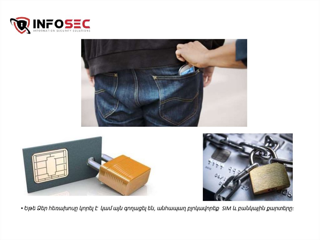 • Եթե Ձեր հեռախոսը կորել է կամ այն գողացել են, անհապաղ բլոկավորեք SIM և բանկային քարտերը:20.