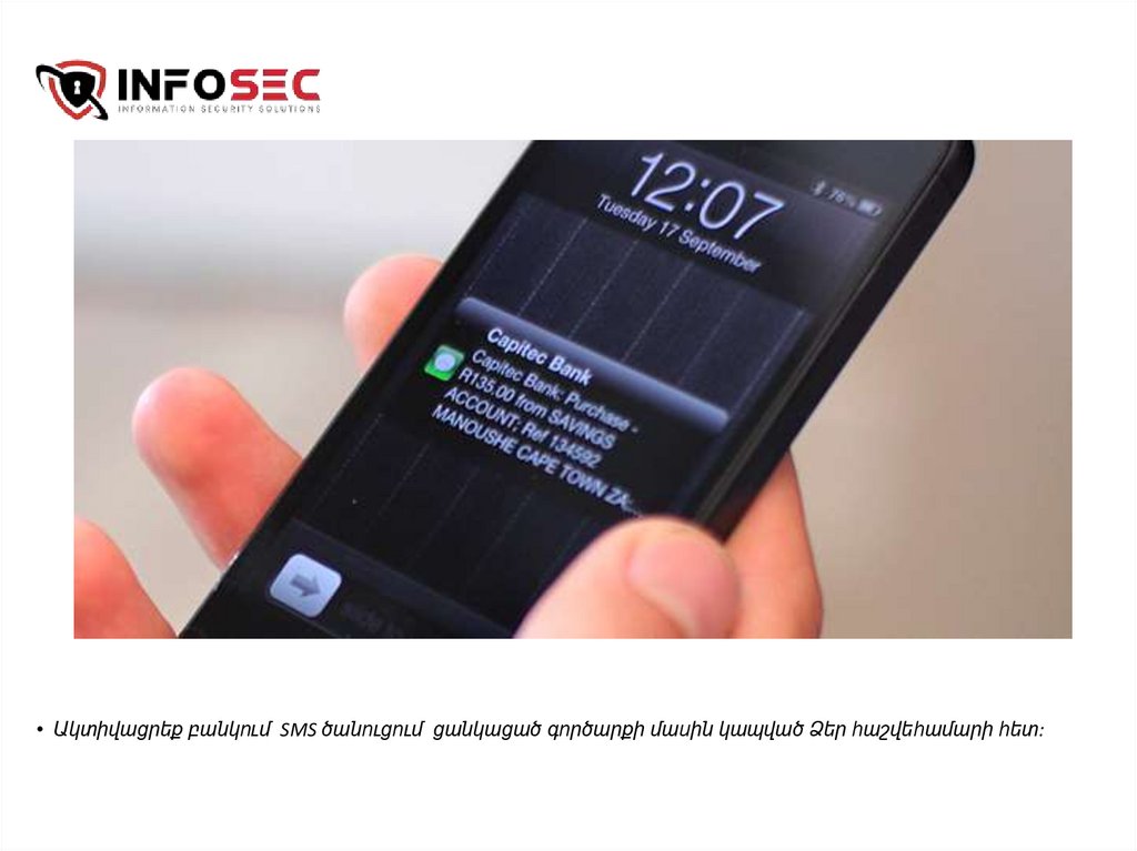 • Ակտիվացրեք բանկում SMS ծանուցում ցանկացած գործարքի մասին կապված Ձեր հաշվեհամարի հետ:26.