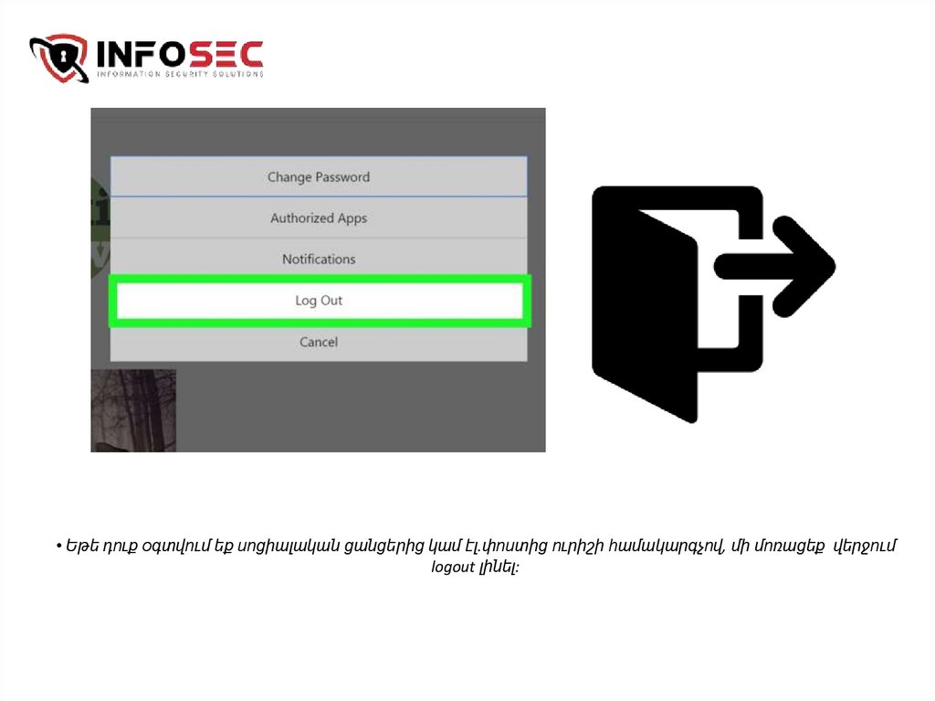 • Եթե դուք օգտվում եք սոցիալական ցանցերից կամ էլ.փոստից ուրիշի համակարգչով, մի մոռացեք վերջումlogout լինել: