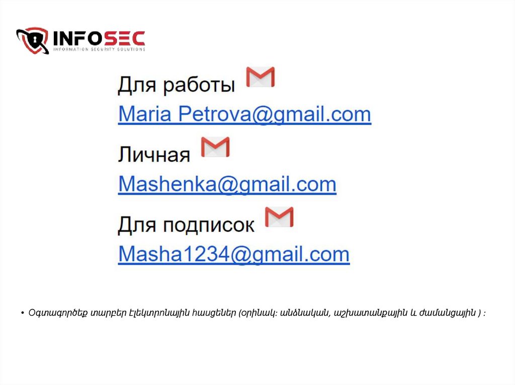 • Օգտագործեք տարբեր էլեկտրոնային հասցեներ (օրինակ: անձնական, աշխատանքային և ժամանցային ) :30.