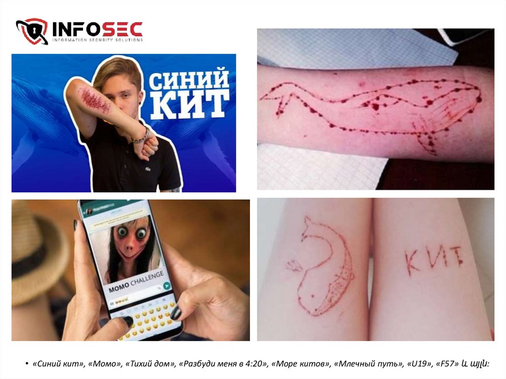 • «Синий кит», «Момо», «Тихий дом», «Разбуди меня в 4:20», «Море китов», «Млечный путь», «U19», «F57» և այլն:34.