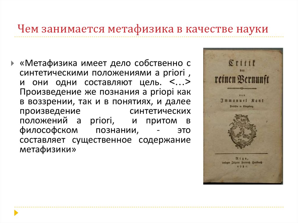 Чем занимается метафизика в качестве науки«Метафизика имеет дело собственно с