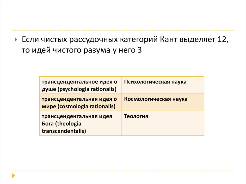 Если чистых рассудочных категорий Кант выделяет 12,то идей чистого разума у него 3