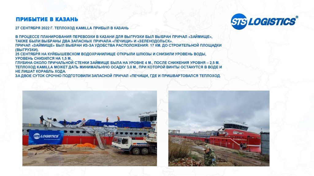 27 СЕНТЯБРЯ 2022 Г. ТЕПЛОХОД KAMILLA ПРИБЫЛ В КАЗАНЬВ ПРОЦЕССЕ ПЛАНИРОВАНИЯ ПЕРЕВОЗКИ В КАЗАНИ ДЛЯ ВЫГРУЗКИ БЫЛ ВЫБРАН ПРИЧАЛ «ЗАЙМИЩЕ»,