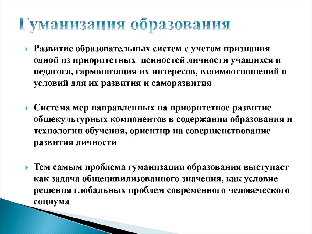 Развитие образовательных систем с учетом признания одной из приоритетных ценностей личности учащихся и педагога, гармонизация