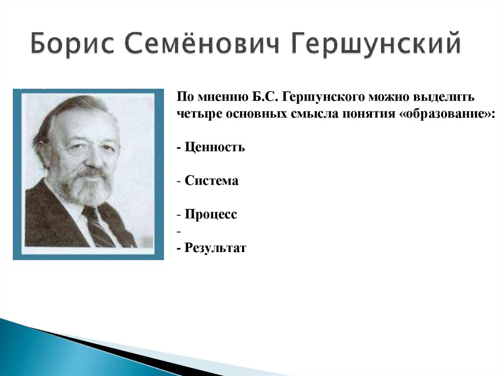 По мнению Б.С. Гершунского можно выделитьчетыре основных смысла понятия «образование»: