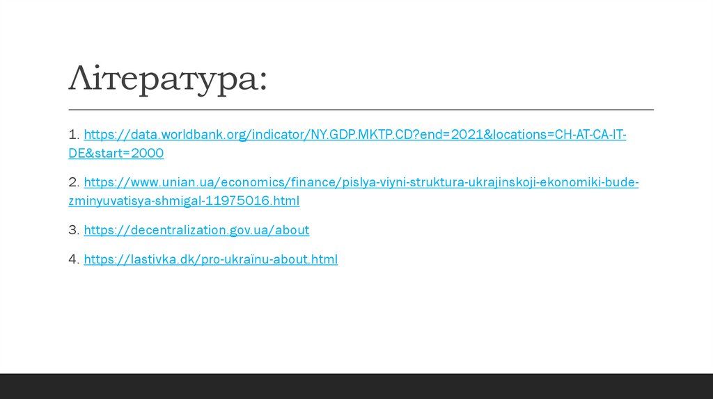 Література:1. https://data.worldbank.org/indicator/NY.GDP.MKTP.CD?end=2021&locations=CH-AT-CA-ITDE&start=2000