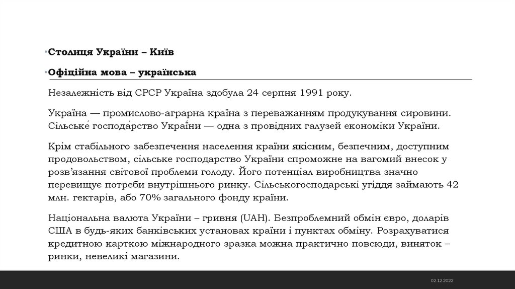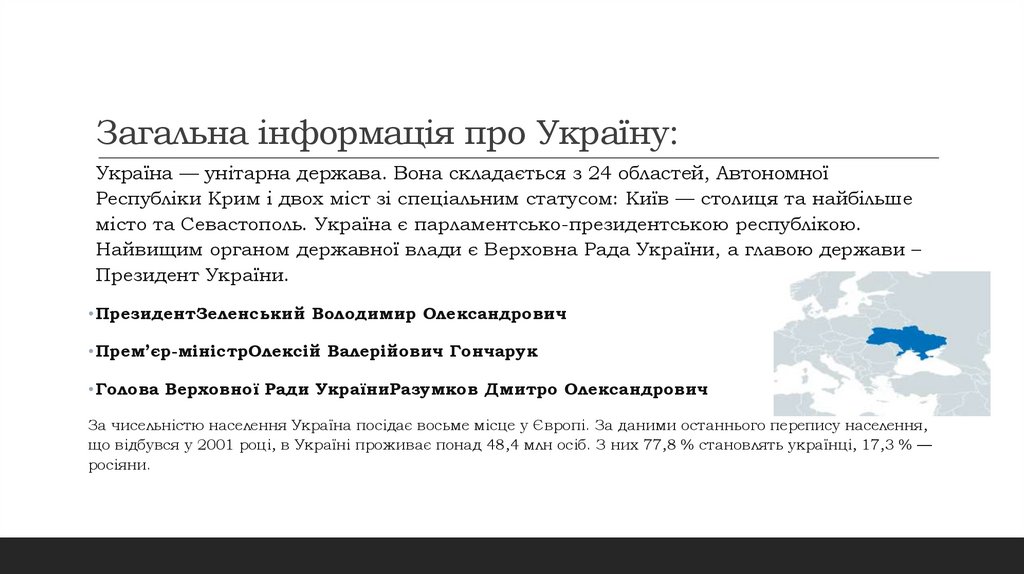 Загальна інформація про Україну:Україна — унітарна держава. Вона складається з 24 областей, Автономної